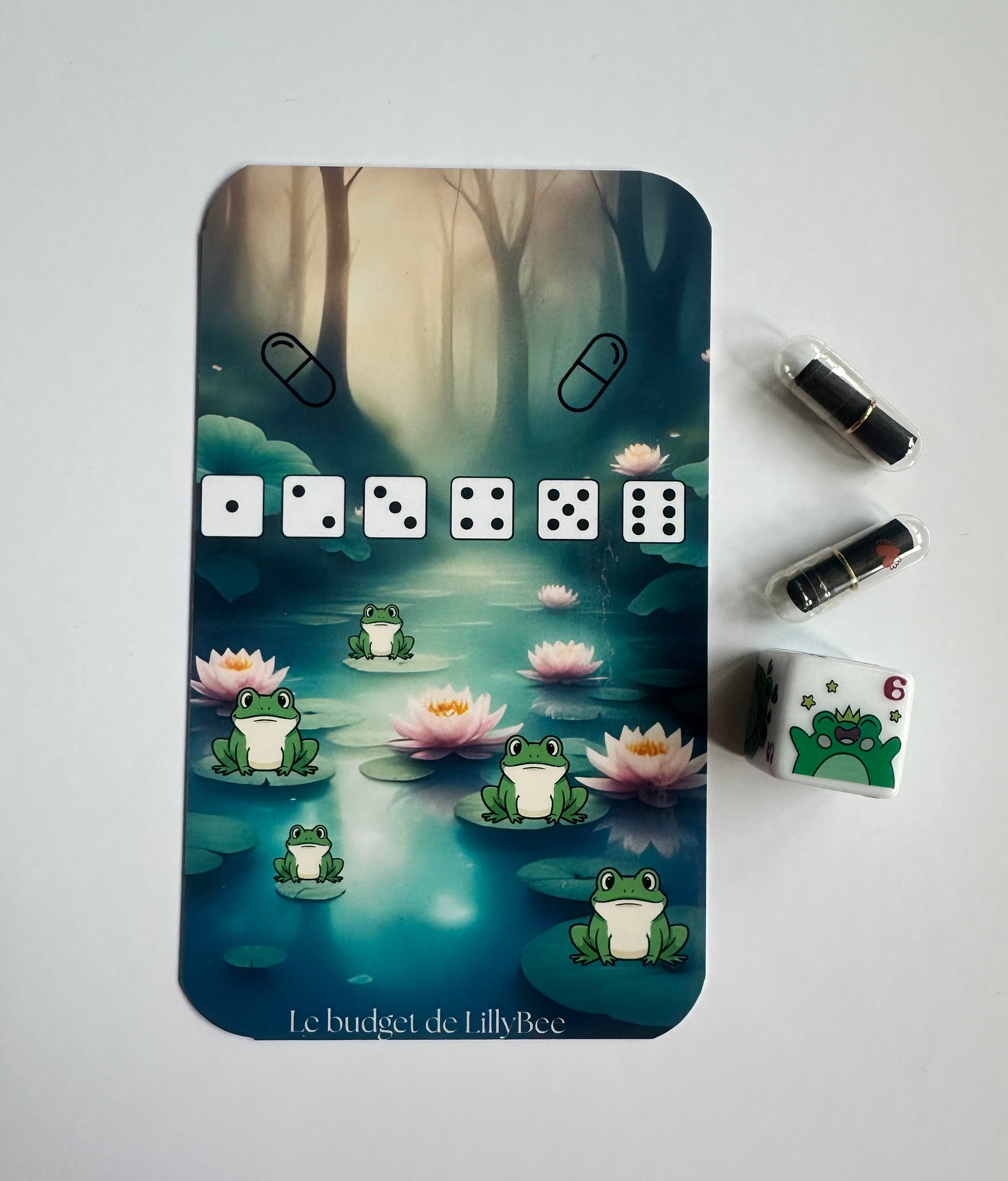 Le défi grenouilles est un défi d’épargne illustré de grenouilles, livré avec ses accessoires : un dé “grenouille” et 2 capsules mystères. L’idée : rendre l’épargne plus légère, plus régulière, et beaucoup plus motivante.
